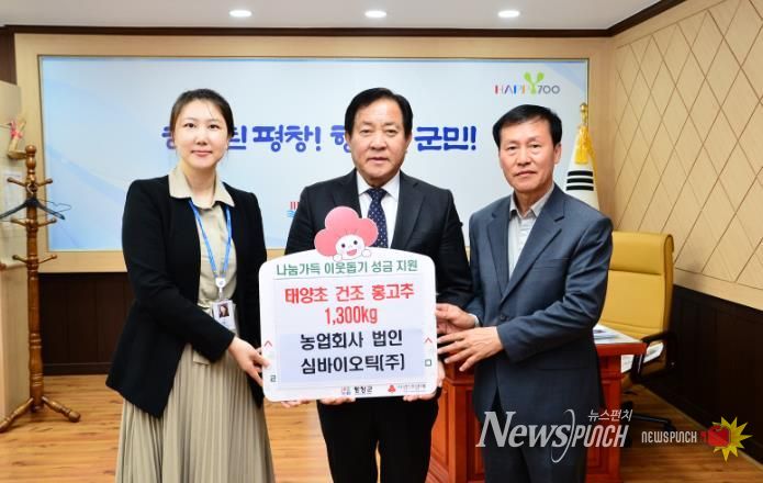 심재국 평창군수는“후원해 주신 홍고추는 평창군기초푸드뱅크를 통해 생활에 어려움을 겪고 있는 이웃들에게 전달될 예정이며, 물품을 기부해주신 농업회사법인 심바이오틱(주) 대표님에게 감사 드린다.”라고 말했다.