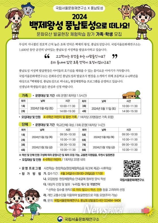 뉴스펀치 김희경 기자 | 문화재청 국립문화재연구원 국립서울문화재연구소(소장 김지연)는 5월 2일부터 11일까지 총 12회에 걸쳐 초등학교 4~6학년 학급 단체와 4~6학년 학생을 동반한 가족(토요일)을 대상으로 풍납토성 서성벽 발굴조사 성과를 친숙하게 알리기 위한 문화유산 체험프로그램『백제왕성, 풍납토성으로 떠나요!』를 운영한다.