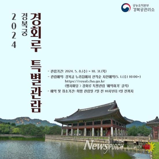 뉴스펀치 김희경 기자 | 문화재청 궁능유적본부 경복궁관리소(소장 고정주)는 오는 5월 8일부터 10월 31일까지(혹서기 7월 제외) 5개월간 매일 4회씩(오전 10시, 오전 11시, 오후 2시, 오후 4시) 경복궁 ‘경회루 특별관람’을 운영한다.