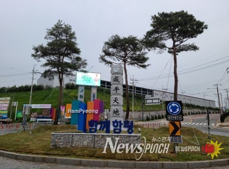 동함평 IC를 빠져나오면 첫눈에 ‘함께 함평’이라는 함평관광 슬로건 및 캐릭터 문자 조형물과 함께, 회전교차로 중앙에 ‘함평천지 만대번영’을 새긴 6m 높이의 시계탑이 자리해 관광객들의 시선을 사로잡는다.