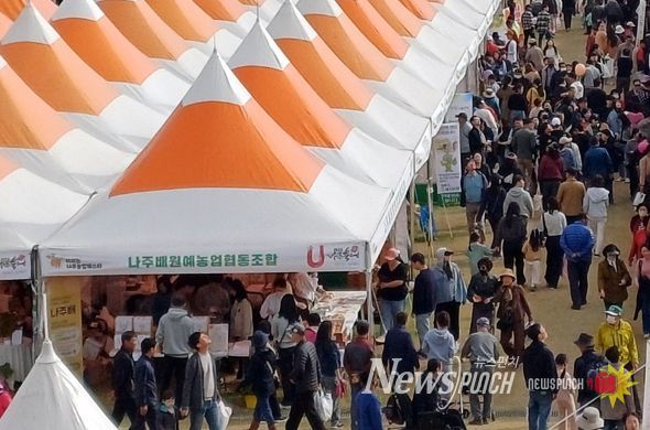 뉴스펀치 고서아 기자 | 전라남도 나주시 통합축제인 ‘2023나주축제, 영산강은 살아있다’와 연계해 열리고 있는 나주농업 페스타가 연일 관광객들로 문전성시를 이루며 축제 흥행 가도에 힘을 보태고 있다.