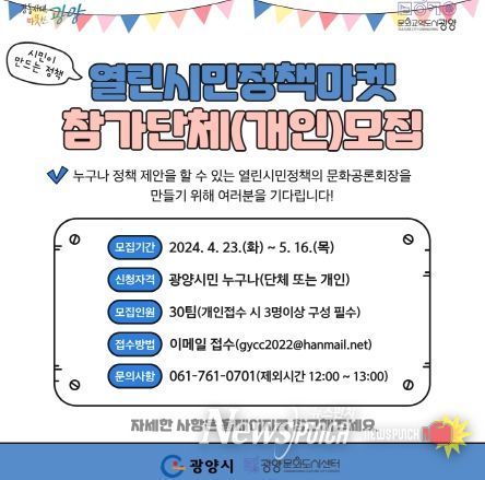 ‘열린시민정책마켓’은 시민이 광양시에 필요하다고 생각하는 도시문화 정책들을 직접 구상해 발표하는 공론의 장으로, 6월 15일 시민광장 야외공연장에서 개최될 예정이다.