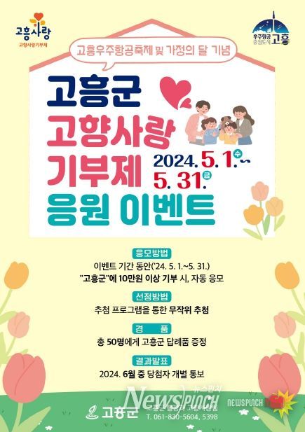 뉴스펀치 김희경 기자 | 고흥군은 제14회 고흥우주항공축제(5.4.∼5.6./고흥군 봉래면 나로 우주센터 일원) 성공 기원과 가정의 달을 기념해 고향사랑기부제 응원 이벤트를 진행한다고 밝혔다.
