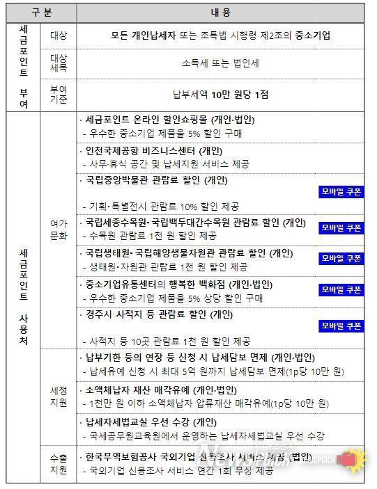 이번 업무협약은 우리나라 문화유산의 보고(寶庫)이자 연간 방문객 수가 4천만 명이 넘는 관광도시인 경주시와 협력하여 세금을 성실하게 납부한 납세자에게 다양한 세금포인트 혜택을 제공하기 위해 추진한 것으로 국세청과 지자체가 손을 맞잡은 첫 협업사례이다.