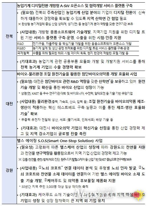제2호 안건은 「지자체 예산 연계 사업 선정 결과(안)」으로 지난 1월에 개최된 제3회 지방협의회에서 예산 연계 후보사업으로 선정된 강원, 대전, 전북, 부산 제안사업 중 강원, 대전, 전북 제안사업을 예산 연계 사업으로 선정했다. 이번에 선정된 사업들은 작년 8월부터 기획에 착수했으며, 전문가 컨설팅을 거쳐 기획을 보완하고, 지방협의회 자문위원회와 소관부처의 두 차례의 검토를 거쳐 최종적으로 선정됐다. 강원, 대전 제안사업은 과기정통부, 전북 제안사업은 산업부에서 ‘25년 신규사업으로 예산을 요구할 예정이다.