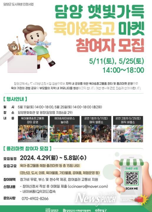 뉴스펀치 김희경 기자 | 담양군은 오는 5월 11일과 5월 25일에 담양문화회관(담양읍 지침6길 29) 광장에서 ‘담양 햇빛가득 육아·중고마켓’ 행사를 개최한다고 밝혔다.