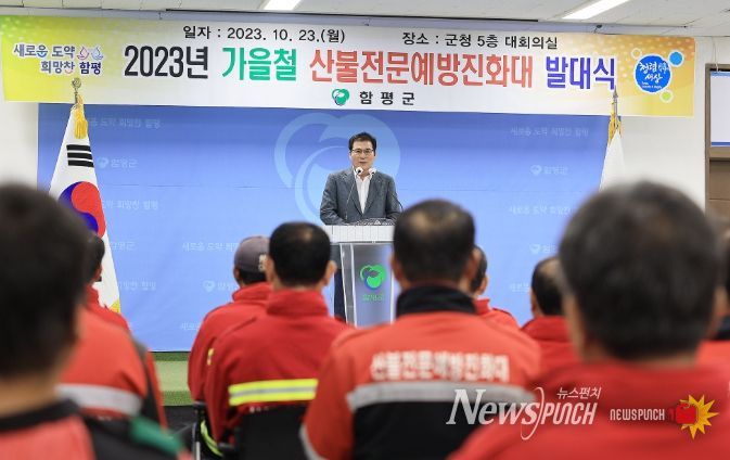 뉴스펀치 고서아 기자 | 전남 함평군이 가을철 산불조심기간을 맞이해 산불전문예방진화대 및 관계자 50명이 참석한 가운데 함평군청 대회의실에서 지난 23일 발대식을 가졌다.