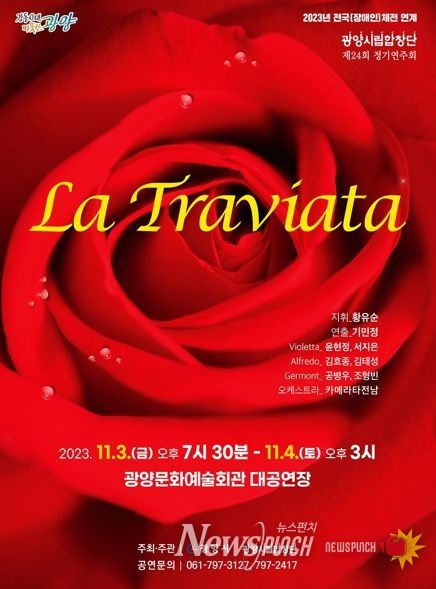 뉴스펀치 고서아 기자 | 광양시립합창단은 오는 11월 3일 저녁 7시 30분, 4일 오후 3시 문화예술회관 대공연장에서 2023년 전국(장애인)체전과 연계해 제24회 정기연주회 오페라 ‘라 트라비아타’를 선보인다고 밝혔다.