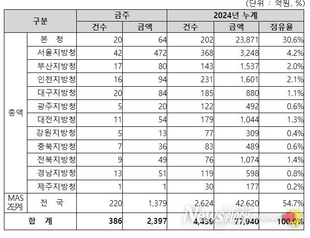 지역별 발주량을 보면, 총액계약 대상 1,018억 원 중 본청이 64억 원으로 6.3%를 집행하고 서울청 등 11개 지방청에서 954억 원을 각각 집행할 예정이다.