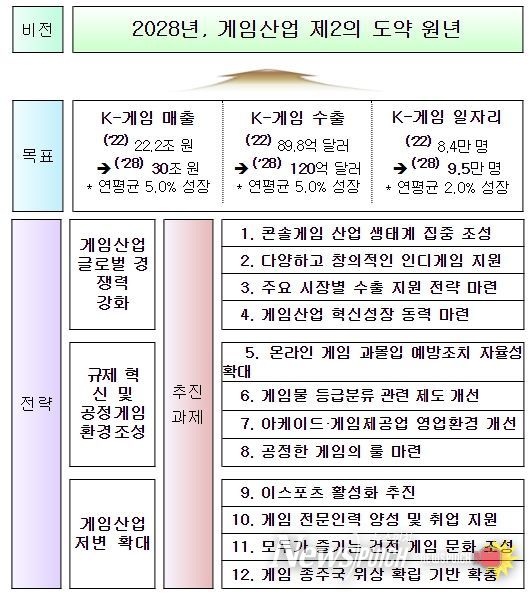 이에 정부는 게임산업에 새로운 성장동력을 마련해 케이-게임이 재도약할 수 있도록 ‘게임산업 진흥 종합계획’을 수립했다. ‘2028년, 게임산업 제2의 도약 원년’을 비전으로, 3대 추진전략과 12개 추진과제를 마련했다.
