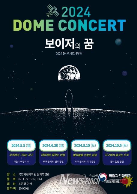 뉴스펀치 장은영 기자 | 국립과천과학관(관장 한형주)은 오늘 5월 5일을 시작으로 2024 돔 콘서트 ‘보이저의 꿈’ 4부작을 개최한다고 밝혔다. 올해 돔 콘서트는 5월부터 10월까지 총 4회 진행되며, 시의성 있는 주제를 마술, 강연, 음악 등 다양한 형태의 공연으로 즐길 수 있도록 구성했다.