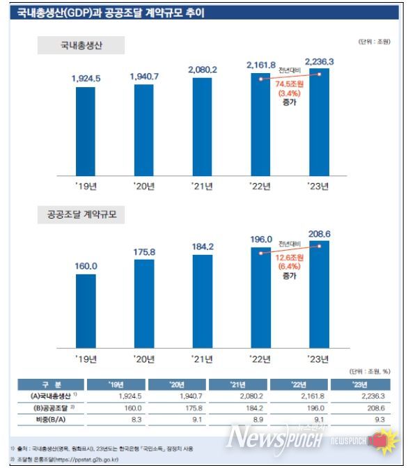 뉴스펀치 장은영 기자 | 2023년 공공조달 전체 계약규모가 전년 대비 12.6조원(6.4%) 증가한 208.6조원으로 2015년 통계작성 이래 역대 최고치를 기록한 것으로 조사됐다.