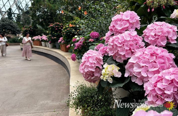 뉴스펀치 김희경 기자 | 전라남도에서 개발·육성한 수국이 서울식물원 ‘봄꽃 향연’ 메인 전시관에서 큰 인기를 모으고 있다.