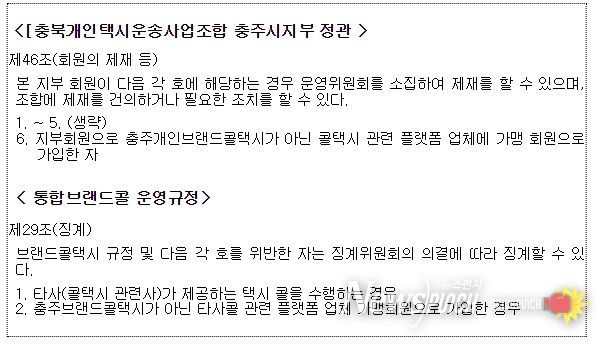 충주시지부는 정관과 운영규정에 충주브랜드콜*이 아닌 다른 사업자의 콜서비스를 수행하거나 다른 사업자의 플랫폼에 가맹회원으로 가입한 회원을 제재할 수 있다는 규정을 포함하여 시행하고, 이를 위반할 경우 제재할 것이라는 내용을 구성사업자들에게 통지했다.