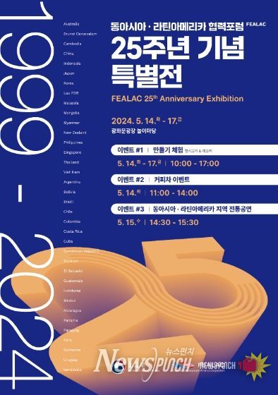 뉴스펀치 장은영 기자 | 동아시아와 라틴아메리카의 문화를 직접 느끼고 접해볼 수 있는 체험의 장(場)이 서울 광화문광장에서 열린다. 외교부는 5월 14일부터 17일까지 광화문광장에서 우리나라 포함 36개 회원국이 참여하는 ‘동아시아-라틴아메리카 협력포럼(FEALAC, Forum for East Asia-Latin America Cooperation) 25주년 기념 특별전’을 개최하기로 하고, 우리 국민이 동아시아와 라틴아메리카의 문화를 체험할 수 있도록 다채로운 볼거리와 즐길 거리를 마련했다.