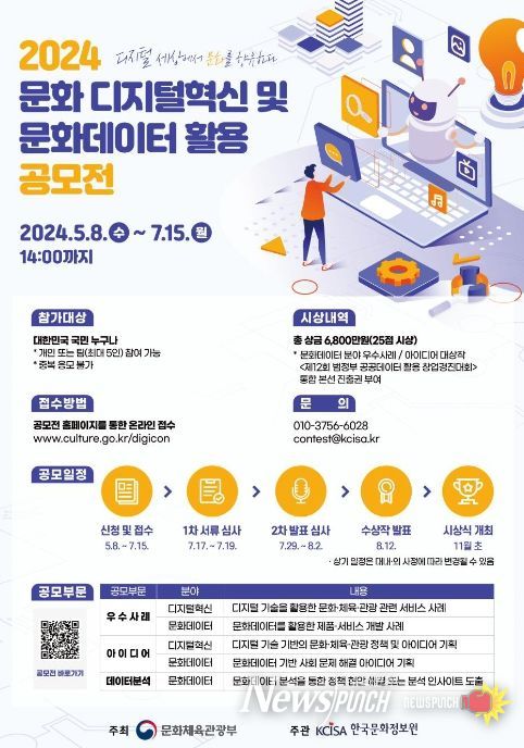 뉴스펀치 김희경 기자 | 문화체육관광부는 한국문화정보원과 함께 5월 8일부터 7월 15일까지 ‘2024 문화 디지털혁신 및 문화데이터 활용 공모전’을 열고 문화 분야에서 디지털 기술 및 문화데이터를 활용한 창의적인 아이디어와 우수사례를 찾는다.