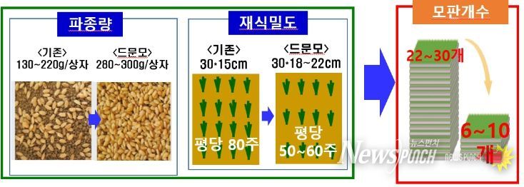 육묘 상자에 뿌리는 볍씨 양을 기존보다 늘려 모내기 때 필요한 육묘 상자 수를 줄일 수 있다. 또한, 논에 심는 모 포기 수를 줄이고, 심는 간격을 넓혀 병해충 발생을 낮추고 벼 쓰러짐을 예방하는 장점이 있다.