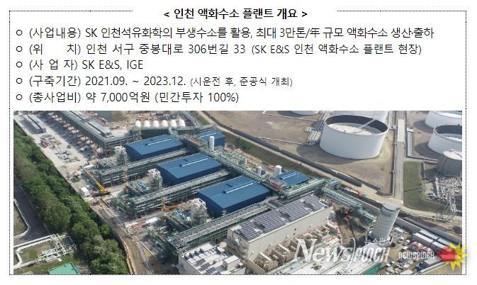 「인천 액화수소 플랜트」는 SK E&S가 총 7천억 원을 투자해 구축한 것으로, 최대 연 3만 톤의 액화수소를 생산할 계획이다. 이는 연간 약 5,000대의 수소버스가 충전할 수 있는 규모로, SK E&S는 동 플랜트와 연계해 금년중 약 20개소를 시작으로 '26년까지 총 40개소의 액화충전소를 전국에 구축하여 액화수소 유통망을 조성해 나갈 계획이다.
