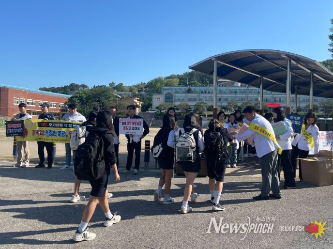 뉴스펀치 김희경 기자 | 영광군은 지난 9일 영광옥당중학교 정문에서 '마약 없는 건강한 영광 만들기' 등굣길 캠페인에 나섰다.