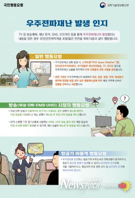 과기정통부와 소속 국립전파연구원 우주전파센터에서는 우주전파재난 매뉴얼에 따른 비상체계를 가동하면서, 항공・항법(국토교통부)・전력(산업통상자원부)・해양(해양수산부) 등 분야에서 발생 가능한 피해상황을 모니터링하고 있다.