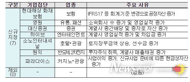 구체적으로 하이브는 엔터테인먼트업 주력집단 최초로 지정됐고, 카지노・관광업 주력집단인 파라다이스, 호텔・관광업 주력집단인 소노인터내셔널 및 아웃도어・스포츠 의류 판매업 주력집단인 영원 등이 신규로 지정됐다.