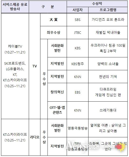뉴스펀치 김희경 기자 | 방송통신위원회는 ‘2023 방송통신위원회 방송대상 수상작’을 시청자들이 무료로 시청할 수 있도록 홈초이스(케이블TV), IPTV 3사, KT 스카이라이프 등에 「방송대상 특별관」을 마련했다고 밝혔다.