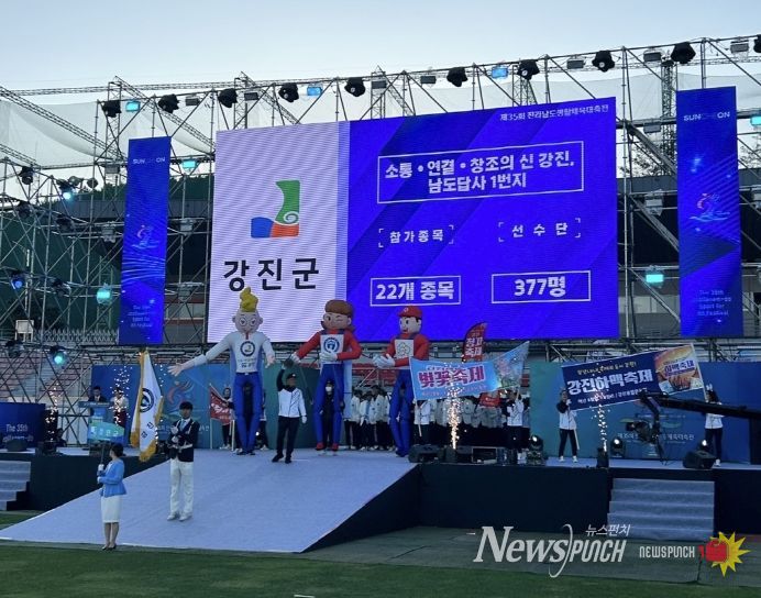 뉴스펀치 고서아 기자 | 강진군 선수단이 10월 24일, 순천 팔마주경기장에서 열린 개회식 시군 선수단 입장식에서 우수상을 수상하고 2천 5백만 원의 상금을 받았다.