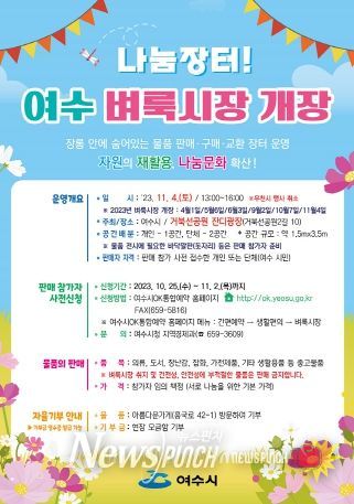 뉴스펀치 고서아 기자 | 올해 마지막 나눔장터! ‘여수 벼룩시장’이 오는 11월 4일거북선공원 잔디광장(거북선공원2길 10)에서 오후 1시부터 4시까지 열린다.