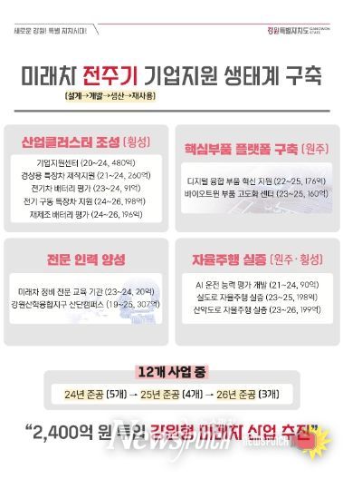 강원형 미래차 산업은 4대 전략 총 12개 세부사업으로 24년 5개 사업 준공을 시작으로 26년까지 준공이 완료되면 설계 → 개발 → 생산 → 재사용까지 미래 차 전주기 기업지원 생태계가 구축된다.