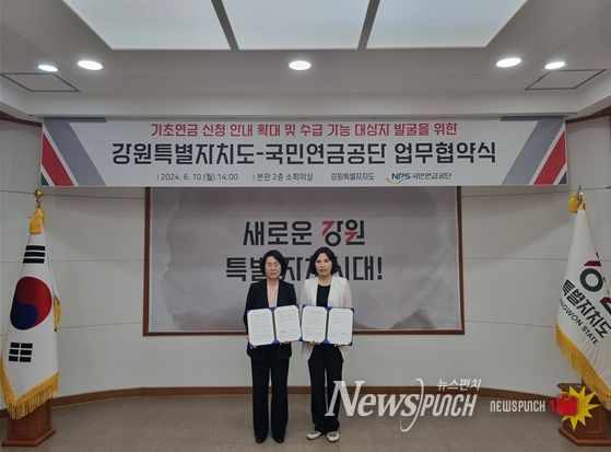 뉴스펀치 김호정 기자 | 강원특별자치도는 국민연금공단과 6월 10일 기초연금 신청 안내 확대와 수급 가능 대상자 발굴을 위한 업무협약을 체결했다.