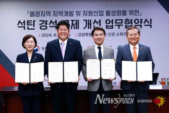 뉴스펀치 김호정 기자 | 태백시는 6월 13일 강원특별자치도청에서 이상민 행정안전부장관, 한화진 환경부장관, 김진태 강원특별자치도지사, 이상호 태백시장이 참석한 가운데 석탄 경석에 대한 체계적인 관리방안을 통해 폐기물 규제를 개선하여 지역 개발과 산업 활용에 지장이 없도록 하는 내용의 업무협약을 체결했다고 밝혔다.