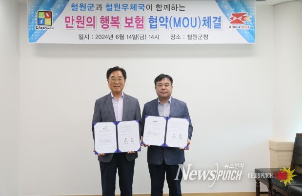 뉴스펀치 김호정 기자 | 철원군은 14일 철원우체국과 함께 저소득을 위한 우체국 “만원의 행복보험” 가입 업무협약을 체결했다고 밝혔다.