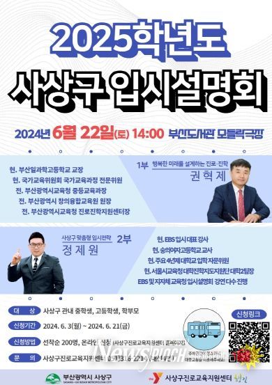 뉴스펀치 박상훈 기자 | 부산 사상구는 ‘행복한 미래를 위한 사상구 맞춤형 입시 전략, 2025학년도 입시설명회’를 6월 22일 오후 2시 부산도서관 모들락 극장(지하 1층)에서 개최한다.