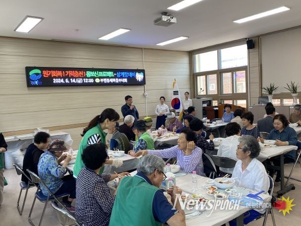 뉴스펀치 박상훈 기자 | 부산 서구 부민동 새마을부녀회는 지난 14일 주민자치위원회, 이웃사랑천사운동후원회 등의 후원으로 여름철 무더위를 건강하게 이겨낼 수 있도록 관내 취약계층 어르신 80세대에게 직접 만든 삼계탕이 들어간 보양식 세트를 대접 및 전달하며 따뜻한 이웃사랑의 정을 나누었다. 이날, 여름철 위생과 청결을 생각한 1인 한상차림으로 음식을 준비하여 어르신들에게 건강한 식사를 대접했다.