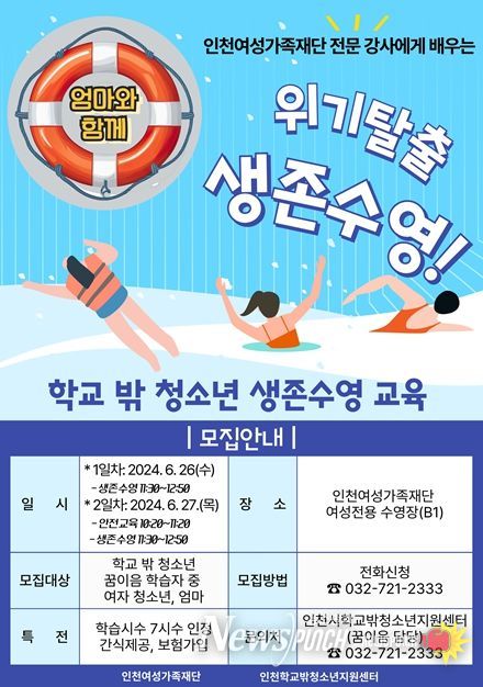 뉴스펀치 김성남 기자 | 재단법인 인천광역시 여성가족재단은 본격 물놀이 철을 앞두고 학교 밖 청소년을 대상으로 생존수영 프로그램을 운영할 예정이다.