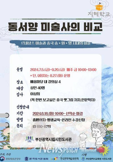 뉴스펀치 박상훈 기자 | 부산광역시립시민도서관은 오는 7월 5일부터 9월 20일까지 매주 금요일 오전 10시부터 강의실 4에서 성인 40명을 대상으로 ‘지혜학교’를 운영한다.