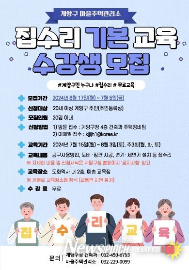 뉴스펀치 김성남 기자 | 인천광역시 계양구가 주거 취약계층 지원을 위한 집수리 서비스 자원봉사자 양성과 주민들의 자활 수리 능력 배양을 위해 ‘2024년 마을주택관리소 집수리 기본교육’을 실시한다.