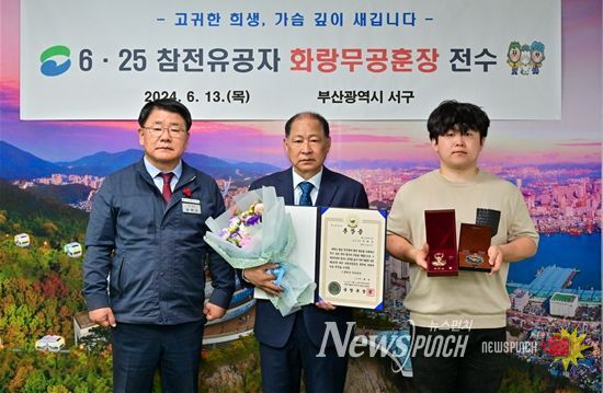 뉴스펀치 박상훈 기자 | 부산 서구는 지난 13일 6·25전쟁에 참전해 공을 세운 故여환승님의 자 여종기 씨와 손 여용직 씨에게 화랑무공훈장을 전수했다.