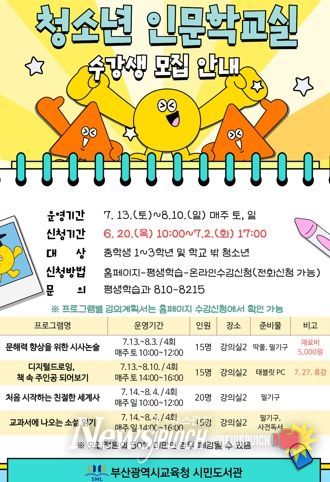 뉴스펀치 박상훈 기자 | 부산광역시립시민도서관은 7월 13일부터 8월 10일까지 매주 토·일요일마다 부산 지역 중학생과 학교 밖 청소년을 대상으로 ‘청소년 인문학교실’을 운영한다.