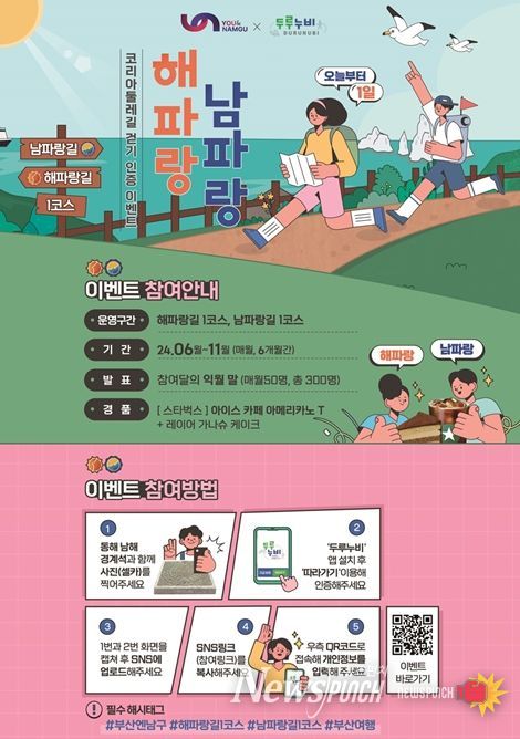 뉴스펀치 박상훈 기자 | 부산 남구는 문화체육관광부 코리아둘레길 쉼터 및 연계 프로그램 지원 공모사업으로 코리아둘레길 걷기 인증 프로그램(부제: 해파랑 남파랑 오늘부터 1일) 이벤트를 운영한다.