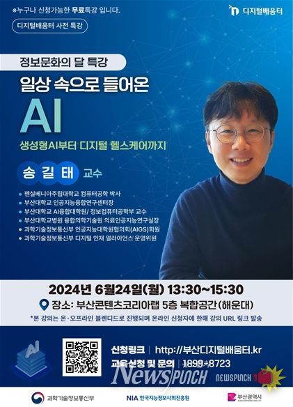 ‘인공지능 특강’은 전국 5개 권역에서 릴레이로 진행된다. 부산에서는 6월 24일 부산콘텐츠코리아랩에서 ‘일상 속으로 들어온 인공지능(AI)’이라는 주제로 생성형 인공지능(AI)과 디지털 헬스케어 관련 내용으로 부산대 인공지능융합연구센터장 송길태 교수가 강의한다.
