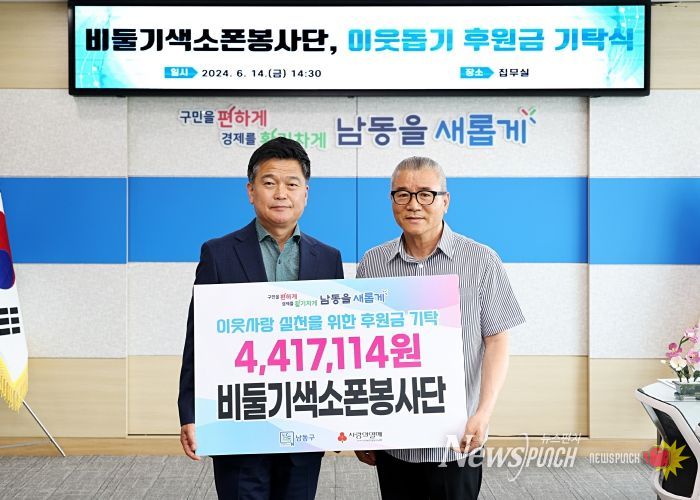 뉴스펀치 김성남 기자 | 인천시 남동구는 비둘기색소폰봉사단으로부터 이웃돕기 성금 441만 원을 기탁받았다고 20일 전했다.
