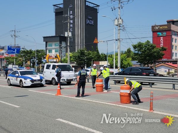 뉴스펀치 박상훈 기자 | 부산 강서구가 6월 18일 지하차도 침수사고 예방을 위해 관‧경‧민 합동 명지동진지하차도 진입로 차단 훈련을 실시했다.