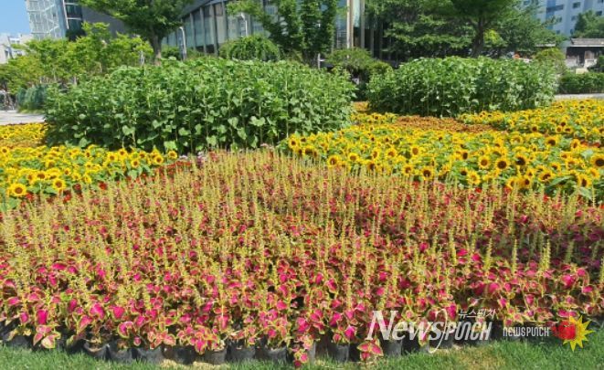 뉴스펀치 박상훈 기자 | 부산시 연제구는 무더운 여름을 맞이하여 부산지하철 3호선 거제역 월드컵대로 도시바람길숲에 해바라기를 주제로 한 ‘꽃정원(팝업가든)’을 설치했다.