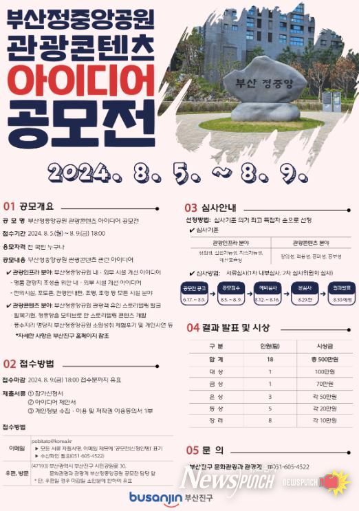 뉴스펀치 박상훈 기자 | 부산진구는 부산의 중심에 위치한 부산정중앙공원을 명품 관광지로 만들기 위해 관광콘텐츠 아이디어 공모전을 실시한다.