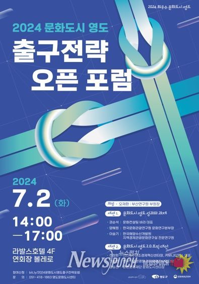 뉴스펀치 박상훈 기자 | 7월 2일 라발스 호텔에서 ‘2024 문화도시 영도 출구전략 오픈 포럼’을 개최한다. 영도구는 2020년 문화체육관광부가 지정하는 제 1차 문화도시로 선정돼 ‘도시 의제를 문화예술로 대응한다’라는 과제를 가지고 다양한 사업을 펼쳐왔다.