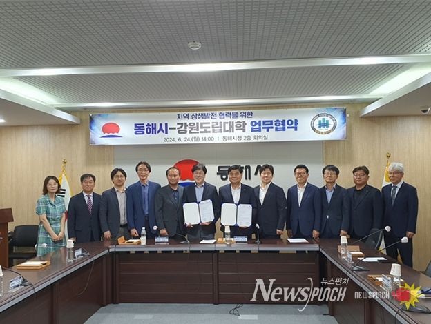 뉴스펀치 김호정 기자 | 강원도립대학교와 동해시는 24일 동해시청에서 지역인재 양성 및 지역혁신과 지역의 상생 발전을 위해 업무협약을 체결했다.