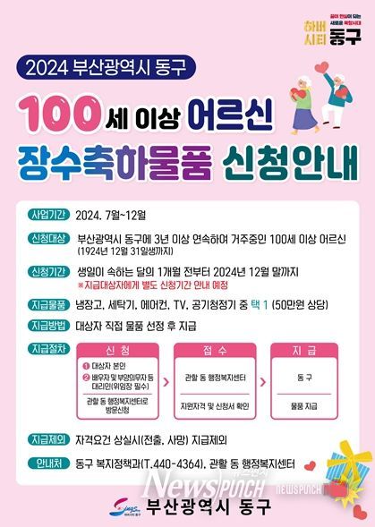 뉴스펀치 박상훈 기자 | 부산 동구는 부산시 16개 구・군중 최초로 100세 이상 어르신들의 장수를 기원하고 경로효친 사상을 고취코자 2024년 7월부터 100세 이상 어르신들에게 장수축하물품을 지원한다.