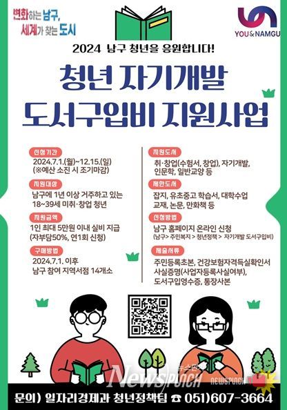뉴스펀치 박상훈 기자 | 부산 남구는 남구에 1년 이상 거주하고 있는 미취업·미창업 청년들에게 자기개발 역량 강화와 취·창업 준비에 대한 경제적 부담을 줄여주기 위한 자기개발 도서 구입비를 1인당 최대 5만원 지원한다고 24일 밝혔다.