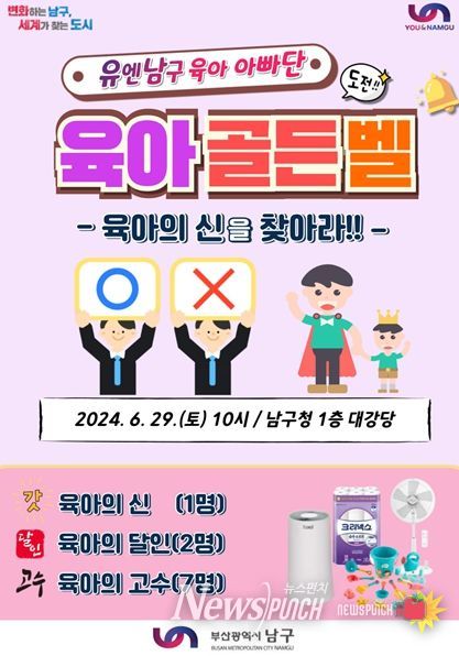뉴스펀치 박상훈 기자 | 부산 남구는 오는 29일 남구청 대강당에서‘유엔남구 육아아빠단’의 육아의 신을 가리는 육아골든벨을 개최한다.